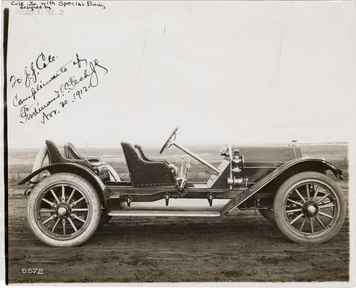 View of Cole 30 car with special body designed by Ferdinand W. Peck, Jr. Handwritten and stamped on front: "Cole 30 with special body designed by Ferdinand W. Peck, Jr. To J.J. Cole. Compliments of Ferdinand W. Peck Jr., Nov. 20, 1912." Stamped on back: "Howe & Arthur, photographers. New Karpen Bldg., Chicago. Phone Harrison 5525. Ferdinand W. Peck, Jr." Handwritten on back: "Cole 30."