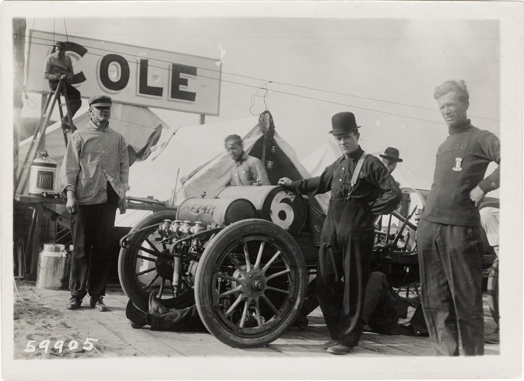 View of driver Bill Endicott and crew posing with Cole car no. 6 during 1910 Brighton Beach races in New York. Tents and "Cole" sign in background. Stamped on back: "Spooner & Wells, Inc., photographers, telephones 3472-3473 Columbus, 1931 Broadway, New York." Handwritten on back: "Bill Endicott (at right), Cole, Brighton Beach, 1910."