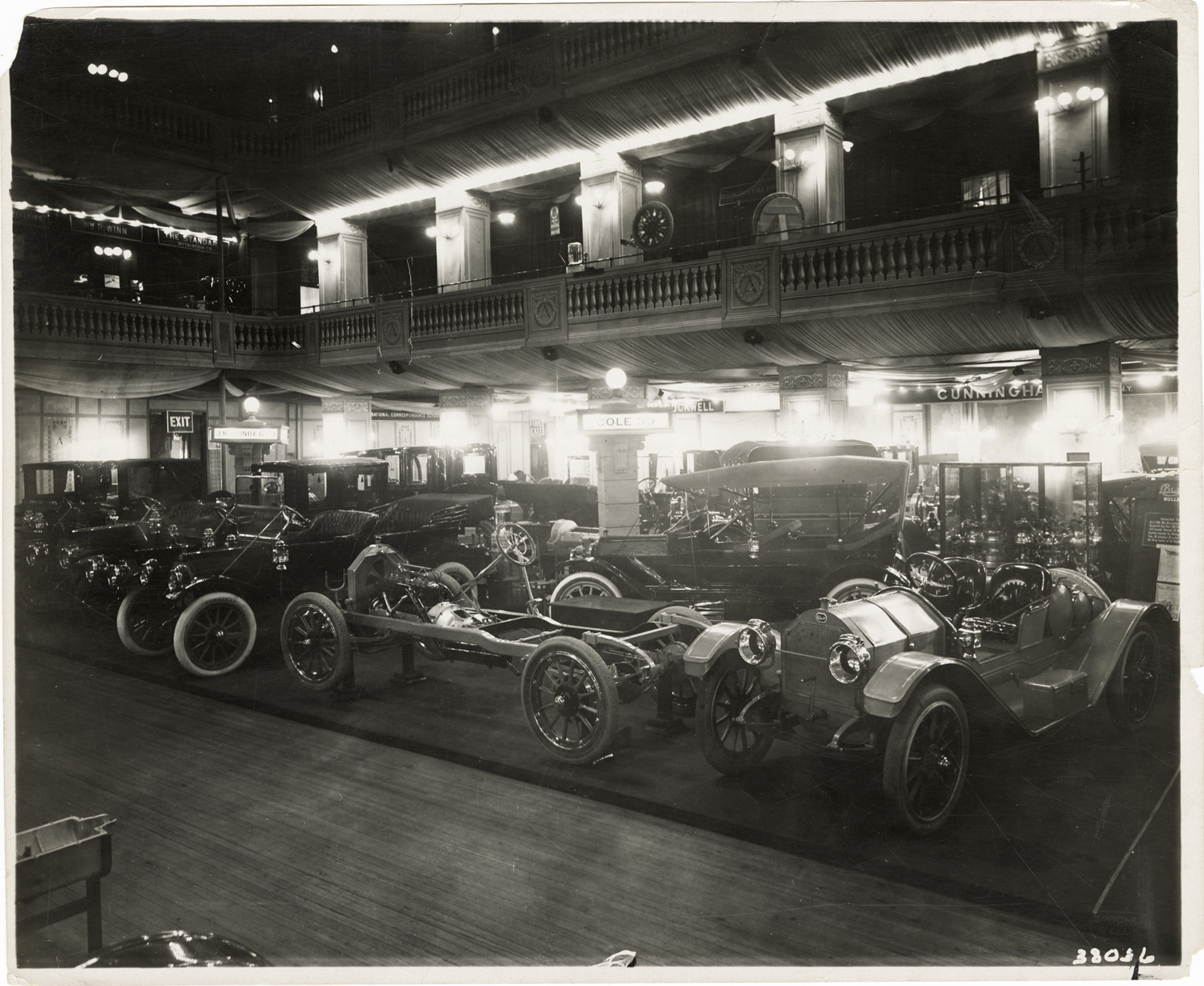 View of Cole cars and chassis on display at trade show. Stamped on back: "Spooner & Wells, Inc., photographers, telephones 3472-3473 Columbus, 1931 Broadway, New York." Handwritten on back: "Cole, c.1910."