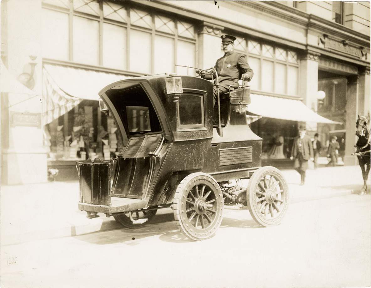 View of a man, wearing cap and uniform, driving a Columbia electric car. Stamped on back: "N. Lazarnick, commercial photographers, 1440 Broadway at 40th Street, New York, N.Y. Tel. Chickering 1717. Cleveland Branch, 5005 Euclid Avenue." Handwritten on back: "Columbia electric."