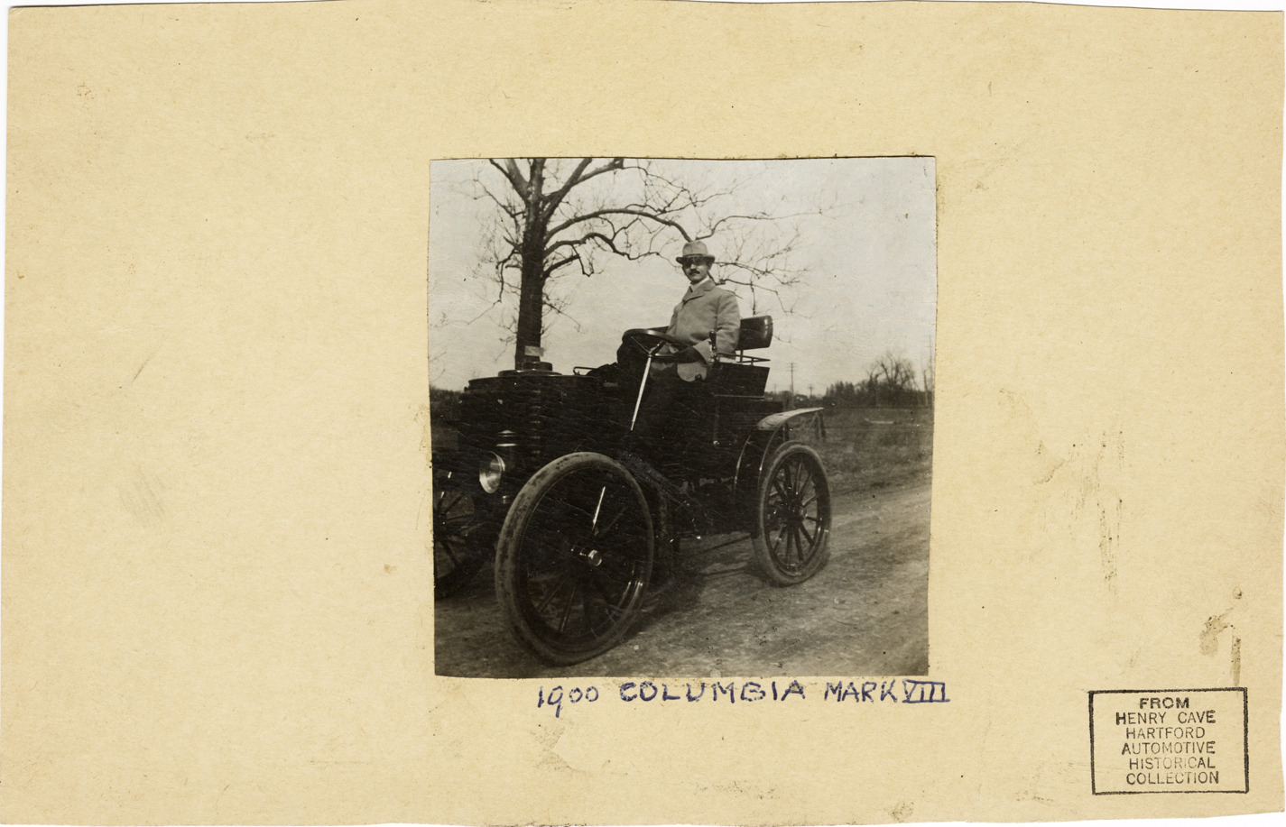 View of Mr. Shultz posing in a 1900 Columbia Mark VIII car. Handwritten on front: "1900 Columbia Mark VIII." Stamped on front: "From Henry Cave Hartford Automobile Historical Collection." Handwritten on back: "Shultz. Supt. Riker Motor Vehicle Co., later asst. to Riker with Locomobile. The first car to have vertical motor in front & shaft drive made in U.S. Ignition governor (1st). Made non-stop 500 mile best in 1899 (1st). Designed in 1898, about 200 made."
