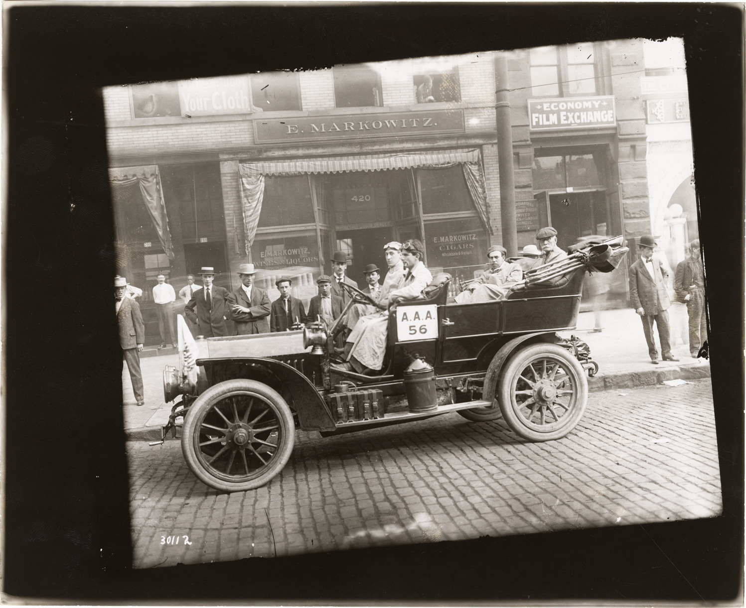 View of motorists posing in Columbia car no. 56 during the 1907 Glidden Tour. Spectators and commercial buildings in background. Stamped on back: "Photographic illustration by Nick Lazarnick, 230 Park Ave., N.Y." Handwritten on back: "Looks more like the Columbia Mark XLIX, Lee, p. 105, 1907, ALAM Handbook. 1907 Auto Topics lists #56 as being a Columbia in Glidden Tour."