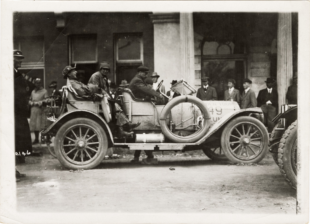 View of motorists in Columbia car no. 49 during the 1911 Glidden Tour. Spectators in background. Stamped on back: "Spooner & Wells, Inc., photographers, telephones 3472-3473 Columbus, 1931 Broadway, New York." Handwritten on back: "Columbia, 1911."