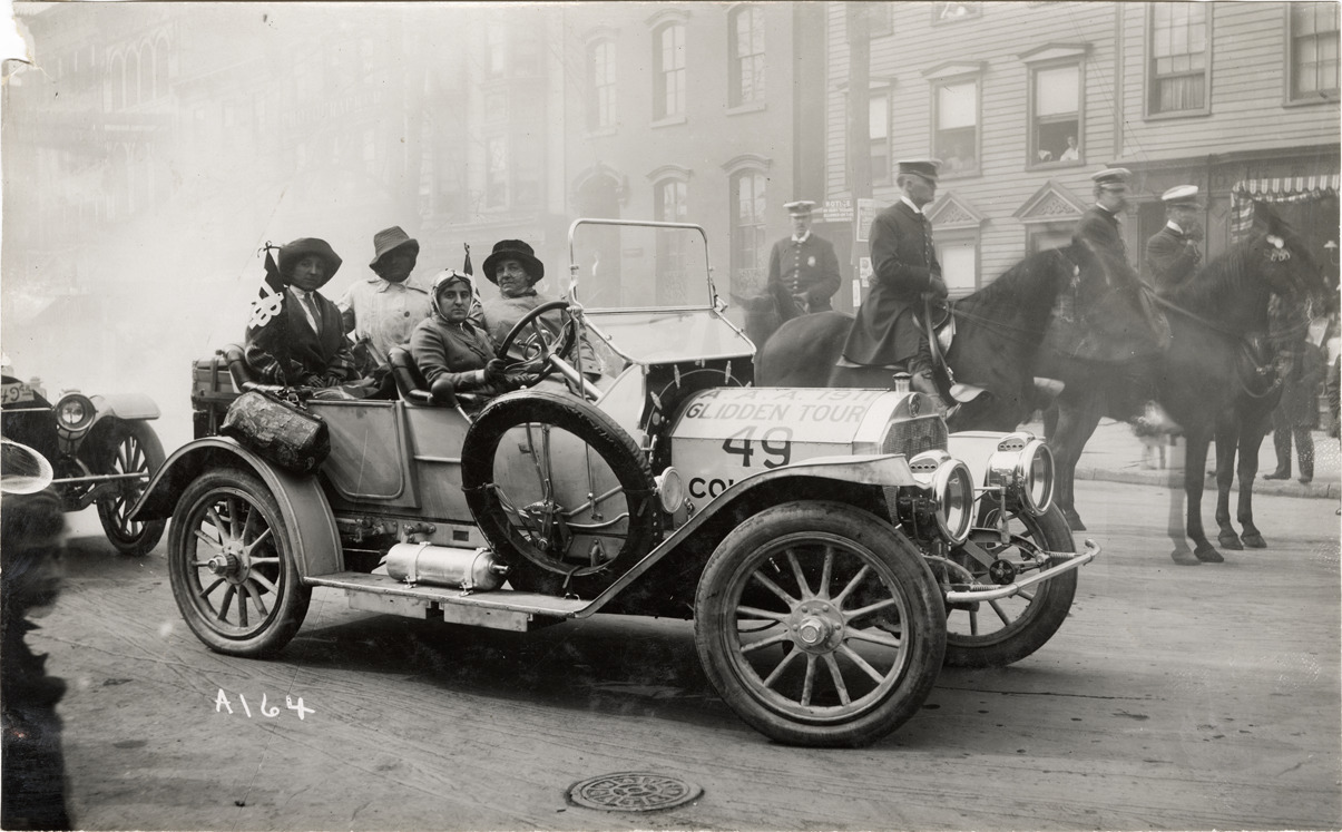 View of Roberta "Birdie" Marks in Columbia car no. 49 with three women passengers during the 1911 Glidden Tour. Policemen on horseback in background. Marks was the only woman driver in the Tour. Stamped on back: "Spooner & Wells, Inc., photographers, telephones 3472-3473 Columbus, 1931 Broadway, New York." Handwritten on back: "Columbia, Glidden, 1911."