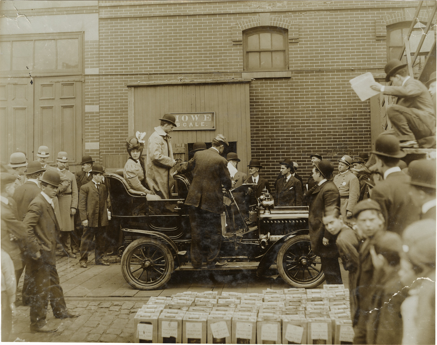 View of motorists in a Compound car, entered by Arnold & Stearns, surrounded by onlookers. Car is being weighed on scale. "Howe scale" sign in background. Fuel cans in foreground. Stamped on back: "Photo by F. Ed. Spooner, 1536 B'way, telephone 6536-38th St., New York, N.Y." Handwritten on back: "#62. Arnold & Stearns, Compound, 16 h.p. Compound, ca. 1905-6."