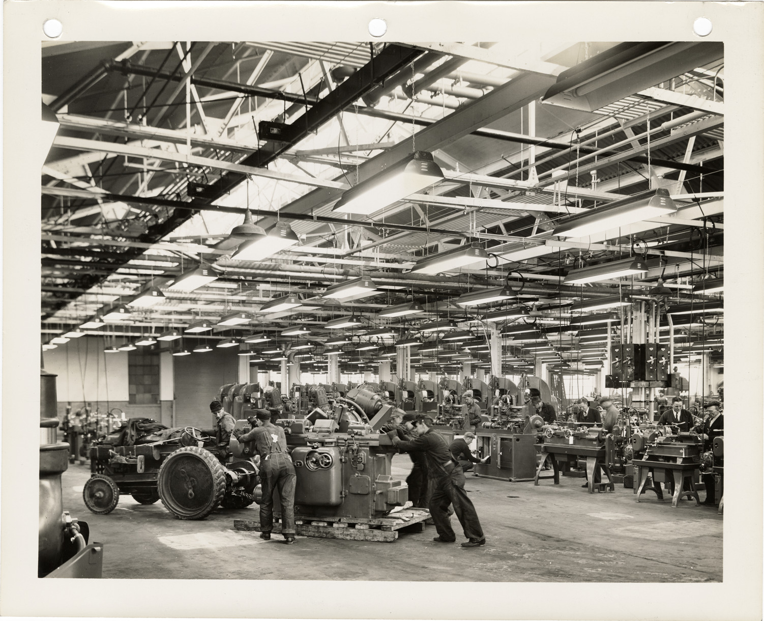 View of workers installing machinery at factory for production of Packard Rolls-Royce Merlin XX engines. Tractor in foreground. Label on back: "Beneath the first light of the fluorescent lamps, toiling crews began the placement of heavy machinery in the pattern of machines that brings the end result of mass production."