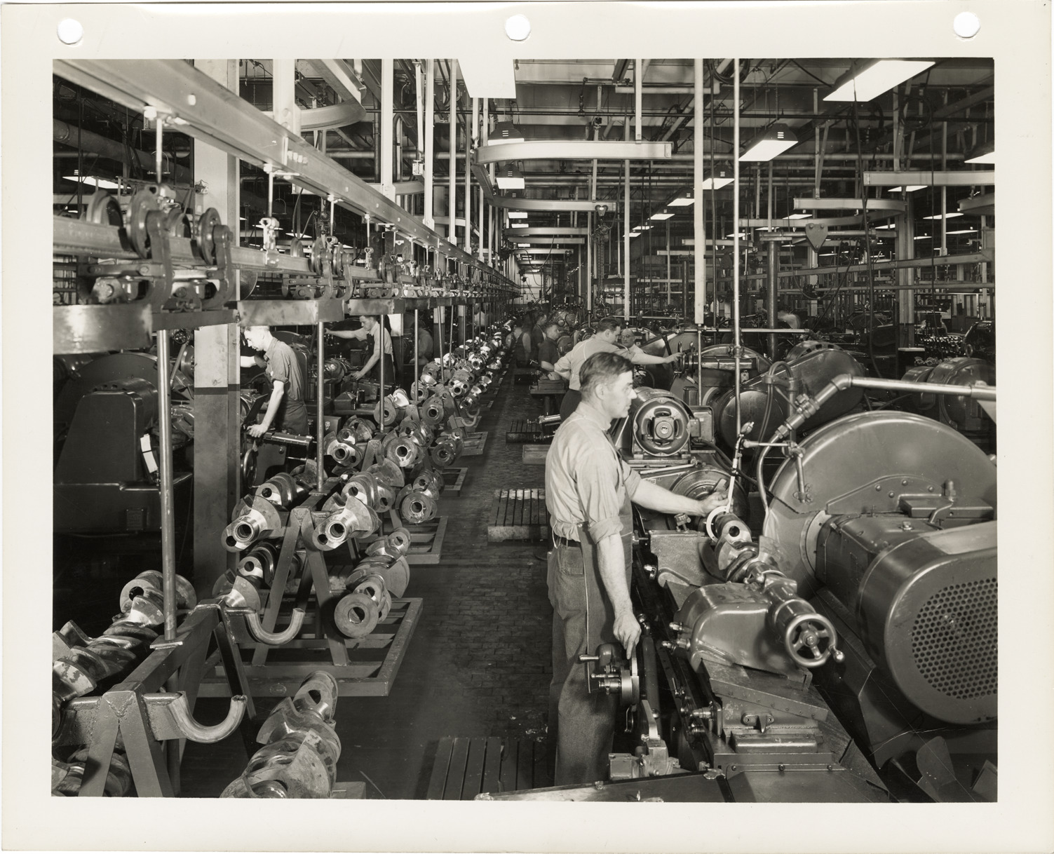 View of factory workers on assembly line for production of Packard Rolls-Royce Merlin XX engines. Label on back: "For the first time in aviation practice, Packard brings the assembly-line technique to the manufacture and finish of crankshafts for the Rolls-Royce Merlin engine. On an overhead track the crankshafts move before a pattern of machines as each performs an operation pointing towards the finished product. Each shaft undergoes eighty-five operations, done on 108 separate machines."