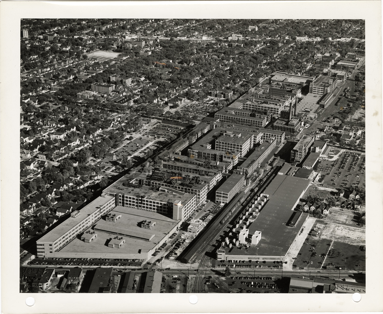 Bird's-eye view of factory for production of Packard Rolls-Royce Merlin XX engines. Label on back: "When Spring came 'round, three great new factories had been built and welded to the mile-long unit of the Packard Motor Car Company. An equal amount of space had been made ready within the existing plants adjoining the new structures."