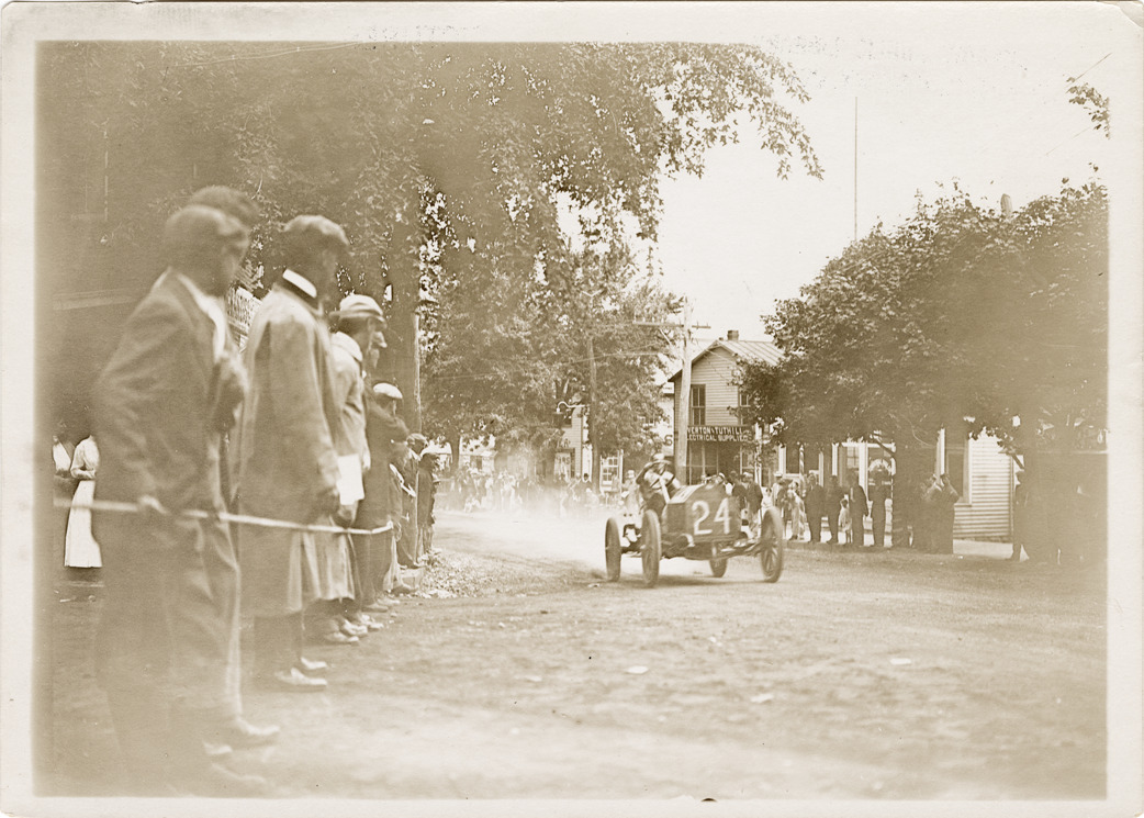 View of Joe Taylor driving Correja car no. 24 during an unidentified race. Stamped on back: "E.A. Waterman, 884 Atlantic Ave., Brooklyn, N.Y., photographer. Photographs taken of any time, any where, terms very reasonable." Handwritten on back: "Taylor in Correja."