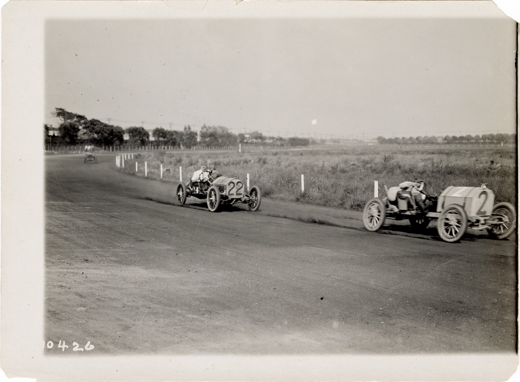 View of Foster driving Correja car no. 2 and Hughes driving Mercer car no. 22 during the 1911 Brighton Beach races. Stamped on back: "Spooner & Wells, Inc., photographers, telephones 3472-3473 Columbus, 1931 Broadway, New York." Handwritten on back: "2, Foster, Correja. 22, Hughes, Mercer, Brighton Beach, 1911."