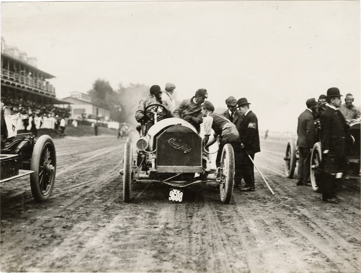 View of Mr. Crawford and passengers in a Crawford car before a race. Officials stand next to car; grandstand on left. Handwritten on back: "Crawford (65 years old) drove the Crawford car. Crawford, ca. 1907."