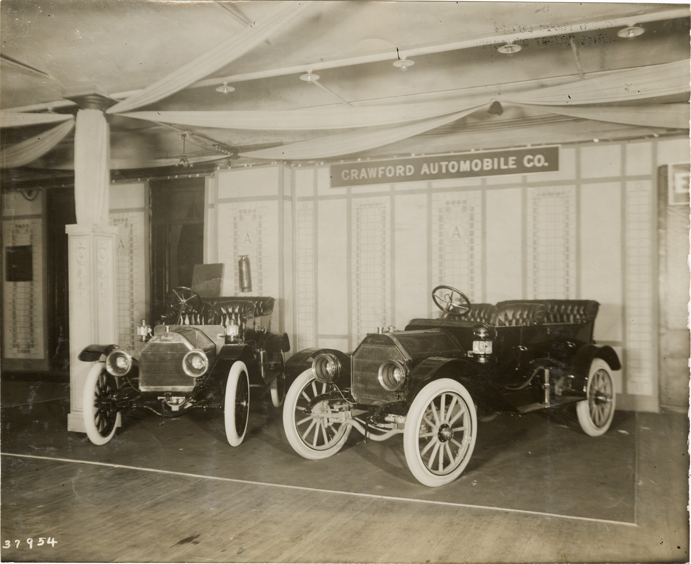 View of 1911 Crawford cars on display in trade show. Banner above exhibit reads: "Crawford Automobile Co." Stamped on back: "Spooner & Wells, Inc., photographers, telephones 3472-3473 Columbus, 1931 Broadway, New York." Handwritten on back: "Crawford, 1911."