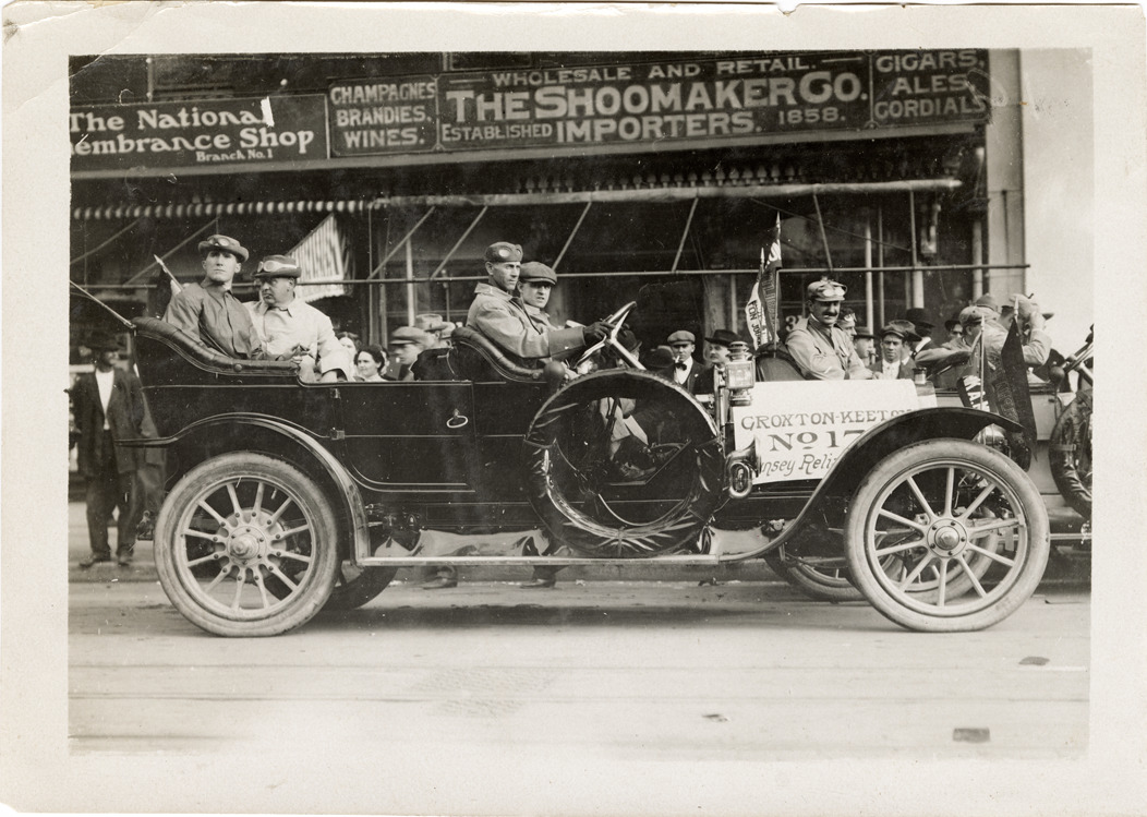 View of motorists posing in Croxton-Keeton car no. 17 during the 1909 Munsey Reliability Run. Spectators stand on sidewalk; Shoomaker Co. importers store in background. Handwritten on back: "Croxton-Keeton, ca. '09. Munsey."