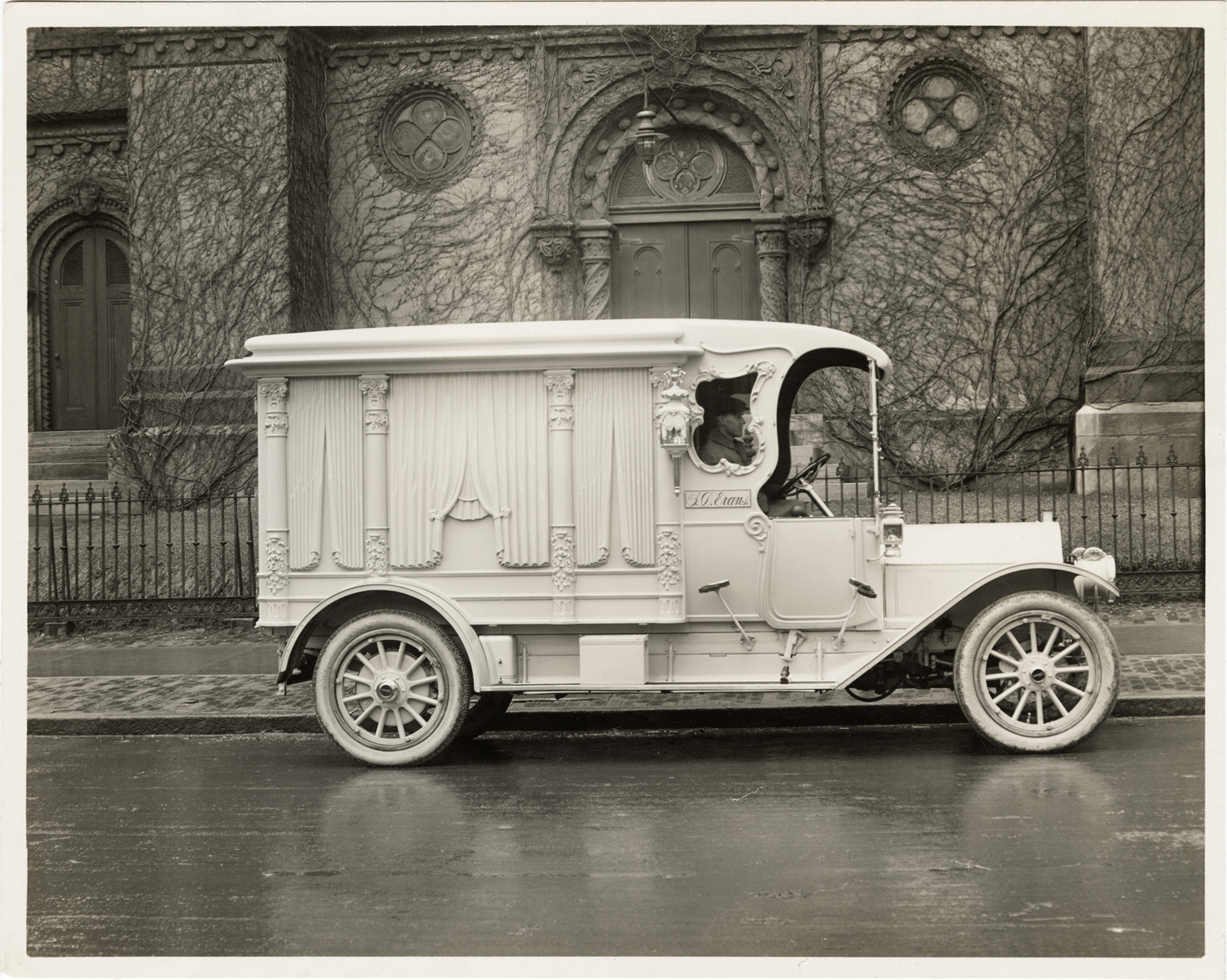 View of a 1912 Cunningham hearse. "S.D. Evans" plaque is affixed to side of hearse. Stamped on back: "James Cunningham, Son & Co., Rochester, N.Y." Handwritten on back: "Cunningham hearse, 920, 1912."