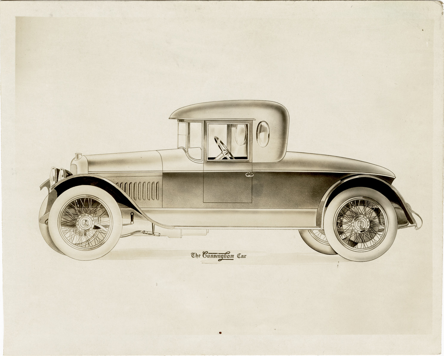Artist's depiction of a 1917 Cunningham Model V car. Printed on front: "The Cunningham car." Stamped on back: "The Cunningham car. Style no. 7A Special. Model V. James Cunningham Son & Co. Rochester, N.Y." Handwritten on back: "1917 Cunningham V. Style #7A Special. 2-passenger enclosed drive. Note: Style #7A, upon which the coupe design was based, was a 2/4 passenger runabout or sporting-type roadster."