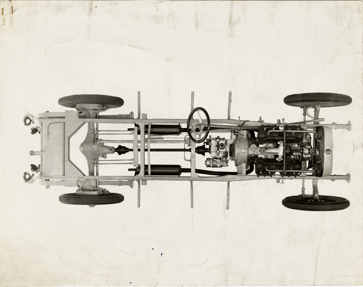 Favorite this☆ 1916 Cunningham automobile chassis Description: Overhead view of the chassis for a 1916 Cunningham Model V car. Stamped on back: "The Cunningham car. Style no. [blank]. Model V, 1916. James Cunningham Son & Co. Rochester, N.Y." Handwritten on back: "Cunningham, 1916." Details Resource ID: na043471 Subject: Automobiles--Chassis James Cunningham, Son & Company Photographic prints Date Issued: Unknown year Format: 1 photographic print mounted on fabric ; 8 x 10 in. Member of: National Automotive History Collection Filing Location: Cunningham, 1915-1917 Rights: Physical rights are retained by DPL. Copyright is retained in accordance with U.S. copyright laws.