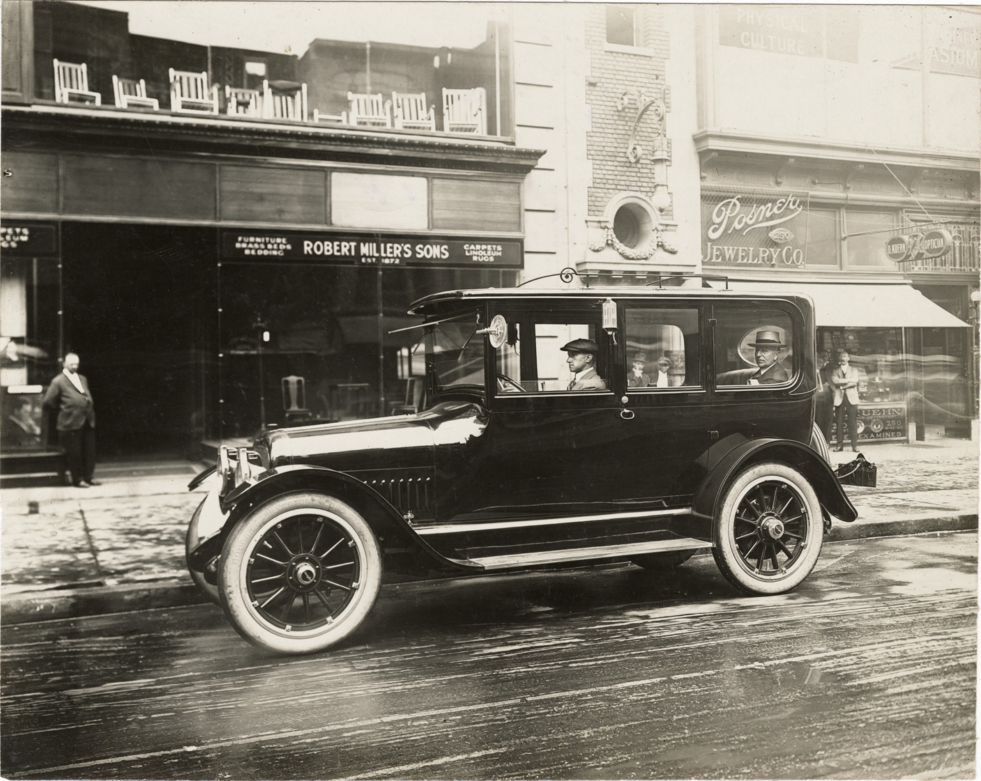 View of motorists posing in a 1916 Cunningham sedan. Storefronts in background. Handwritten on back: "1916 Cunningham Series V. Style #21A. 5-passenger, 2-door sedan. Cunningham, 1916."