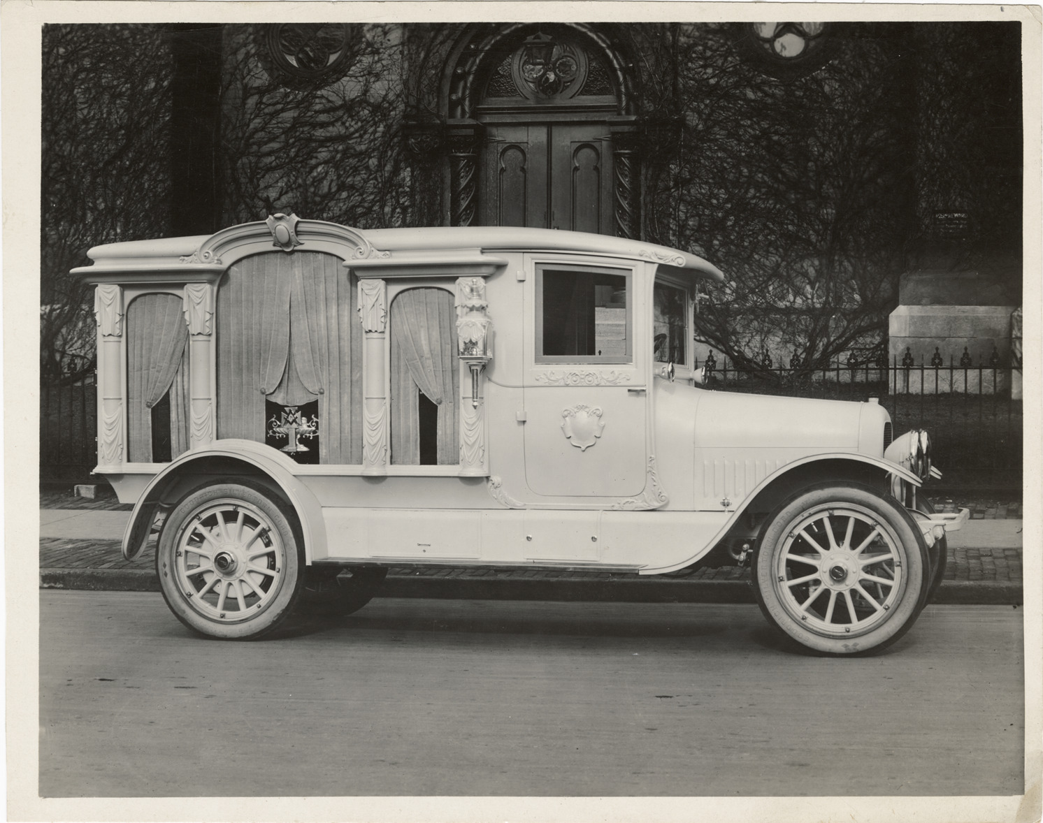 View of a 1917-1919 Cunningham hearse. Stamped on back: "The Cunningham car. Style no. 26A. Model V. James Cunningham Son & Co. Rochester, N.Y." Handwritten on back: "Cunningham, 1916-19."