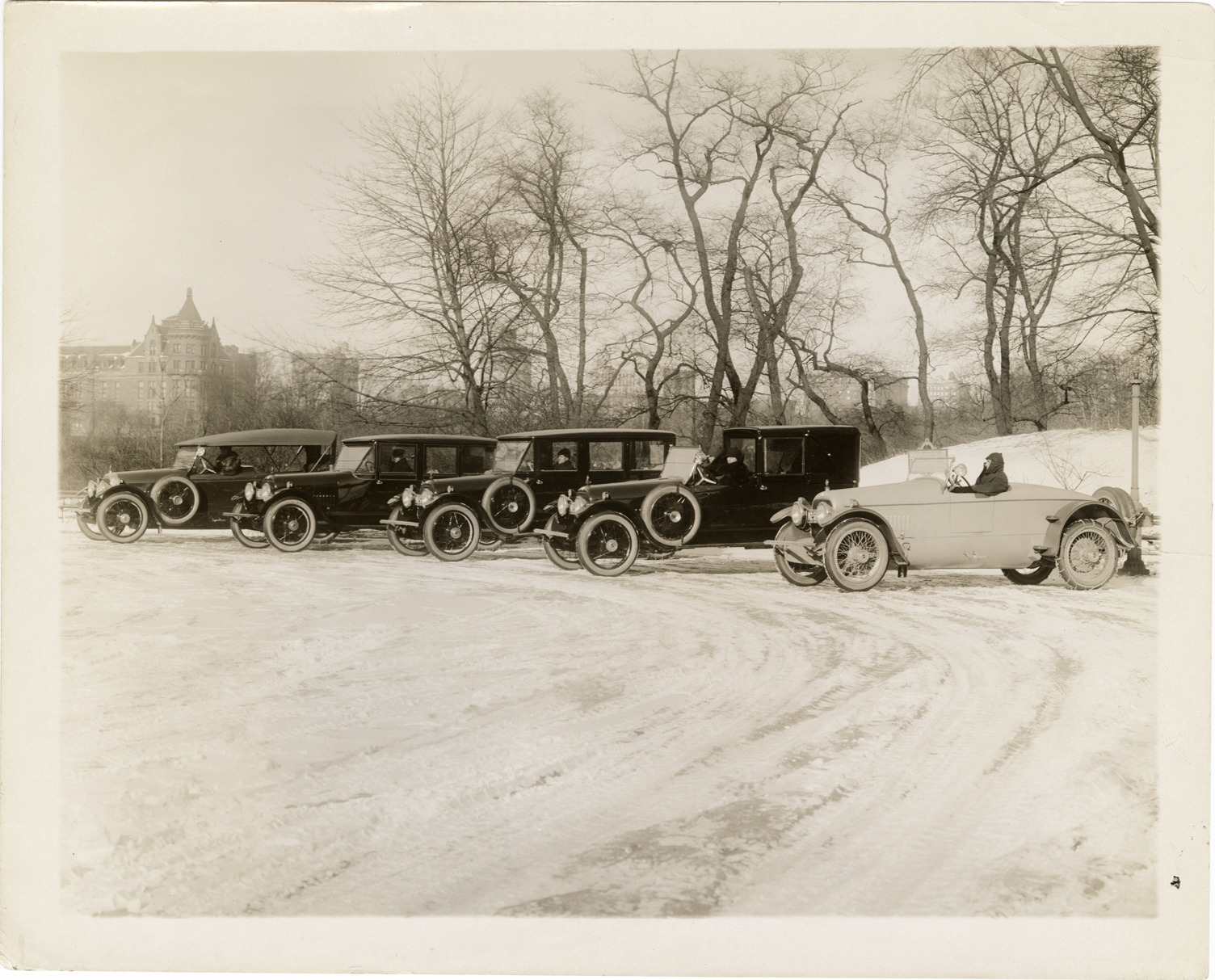 View of five 1918 Cunningham automobiles that were exhibited at the 14th Annual Automobile Salon in New York, New York. Stamped on back: "Photo by N. Lazarnick. 244-6-8 W. 42nd Street, N.Y. Tel. 594 Bryant. In ordering duplicates mention number on back of this print." Handwritten on back: "1918 Cunninghams exhibited on the Cunningham stand, 14th Annual Automobile Salon, Hotel Astor, New York. 2-9 January 1918. The cars from right to left. 1) Special roadster with rumble seat concealed in the rear deck. This car illustrated, Motor Age, Jan. 10, 1918, p. 15. Motor Life, Feb. 1918, p. 21. Vanity Fair, June 1918, p. 68. Vanity Fair, July 1918, p. 56 (interior). Vanity Fair, August 1918, p. 57. 2) Fully-collapsible cabriolet (Style 56-A) on 142" whb. This car illustrated Art & Decoration, Nov. 1920, p. 31. 3) Enclosed drive limousine (Style #64A) on 142" whb. 4) Enclosed drive on 142" whb. 5) 6-passenger touring car (Style #59A) on 142" whb."