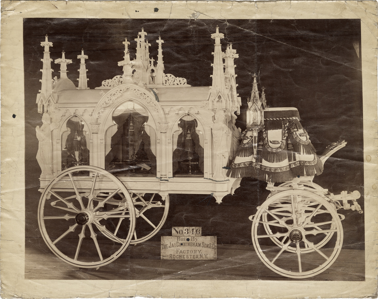Favorite this☆ Cunningham hearse no. 346 Description: View of Cunningham horse-drawn hearse no. 346. Printed on front: "No. 346. Built by the Jas. Cunningham, Son & Co. Factory, Rochester, N.Y." Details Resource ID: na043520 Subject: Hearses (Vehicles) Horse-drawn vehicles James Cunningham, Son & Company Photographic prints Date Issued: Unknown year Format: 1 photographic print mounted on fabric ; 8 x 10 in. Member of: National Automotive History Collection Filing Location: Cunningham (Horse-drawn) Rights: Physical rights are retained by DPL. Copyright is retained in accordance with U.S. copyright laws.