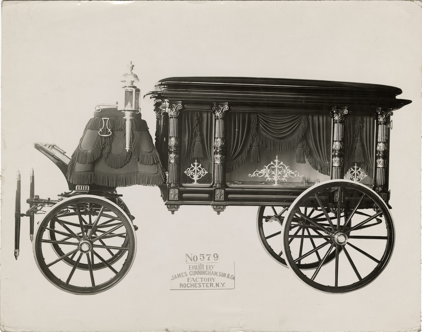 Favorite this☆ Cunningham hearse no. 579 Description: View of Cunningham horse-drawn hearse no. 579. Printed on front: "No. 579. Built by James Cunningham, Son & Co. Factory, Rochester, N.Y." Details Resource ID: na043527 Subject: Hearses (Vehicles) Horse-drawn vehicles James Cunningham, Son & Company Photographic prints Date Issued: Unknown year Format: 1 photographic print mounted on fabric ; 7.75 x 10 in. Member of: National Automotive History Collection Filing Location: Cunningham (Horse-drawn) Rights: Physical rights are retained by DPL. Copyright is retained in accordance with U.S. copyright laws.