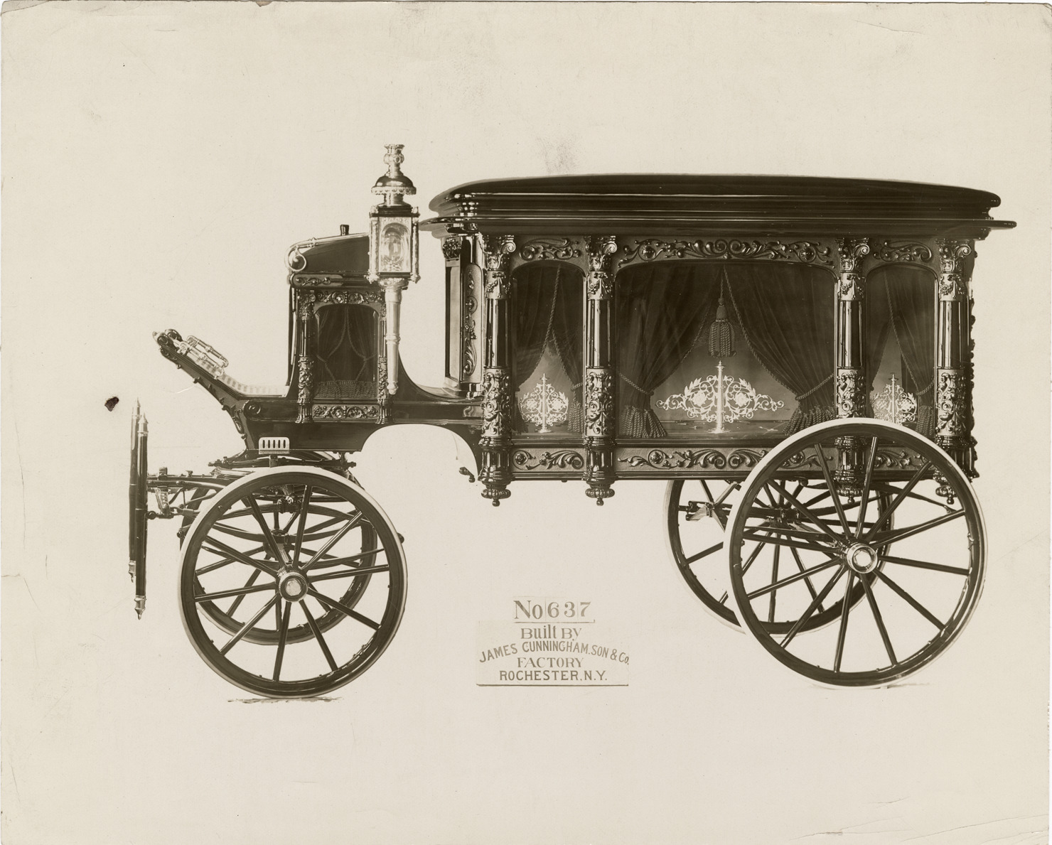 Favorite this☆ Cunningham hearse no. 637 Description: View of Cunningham horse-drawn hearse no. 637. Printed on front: "No. 637. Built by James Cunningham, Son & Co. Factory, Rochester, N.Y." Details Resource ID: na043531 Subject: Hearses (Vehicles) Horse-drawn vehicles James Cunningham, Son & Company Photographic prints Date Issued: Unknown year Format: 1 photographic print mounted on fabric ; 8 x 10 in. Member of: National Automotive History Collection Filing Location: Cunningham (Horse-drawn) Rights: Physical rights are retained by DPL. Copyright is retained in accordance with U.S. copyright laws.