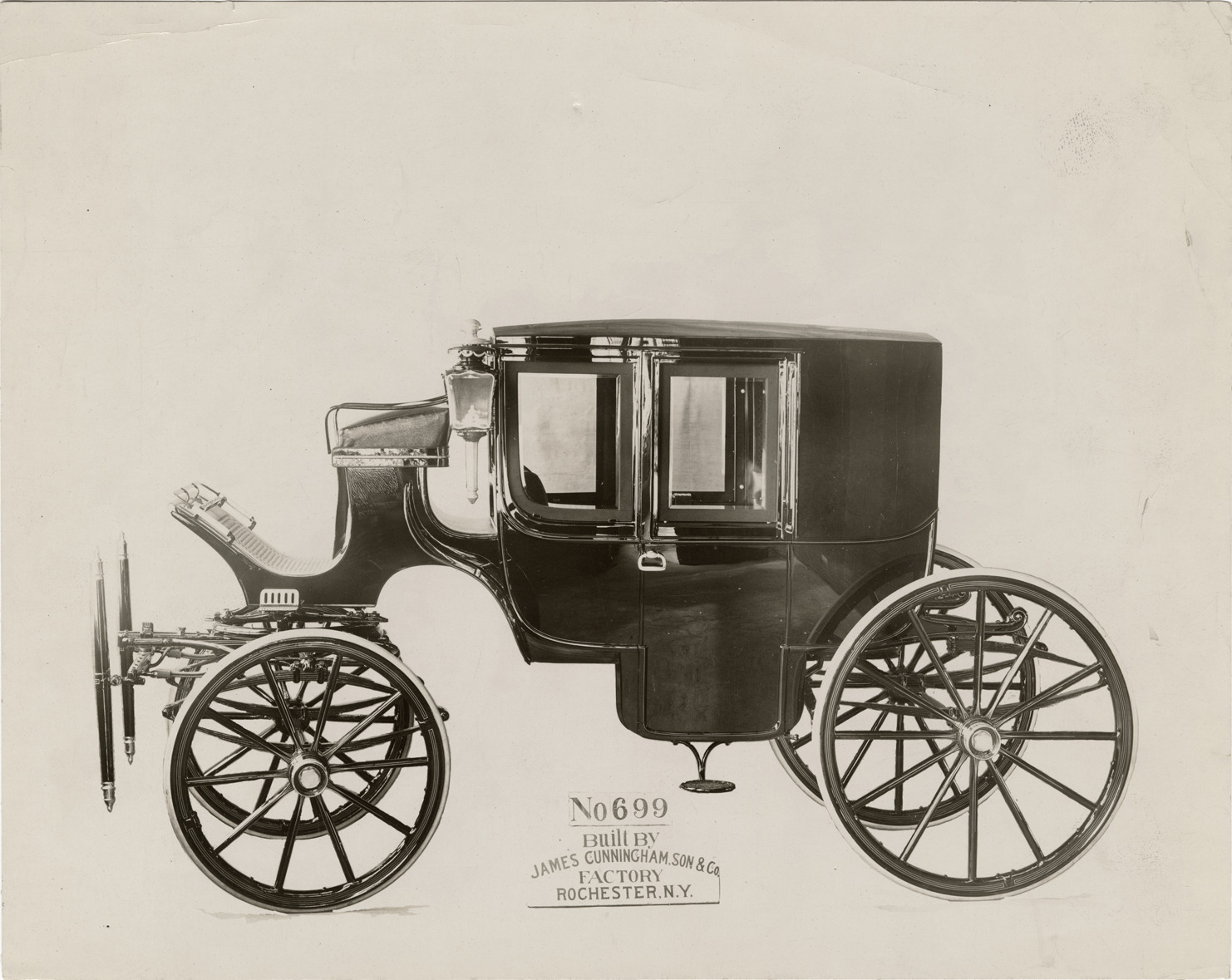 Favorite this☆ Cunningham carriage no. 699 Description: View of Cunningham horse-drawn carriage no. 699. Printed on front: "No. 699. Built by James Cunningham, Son & Co. Factory, Rochester, N.Y." Handwritten on back: "Berlin coach." Details Resource ID: na043544 Subject: Carriages and carts Horse-drawn vehicles James Cunningham, Son & Company Photographic prints Date Issued: Unknown year Format: 1 photographic print mounted on fabric ; 8 x 10 in. Member of: National Automotive History Collection Filing Location: Cunningham (Horse-drawn) Rights: Physical rights are retained by DPL. Copyright is retained in accordance with U.S. copyright laws.