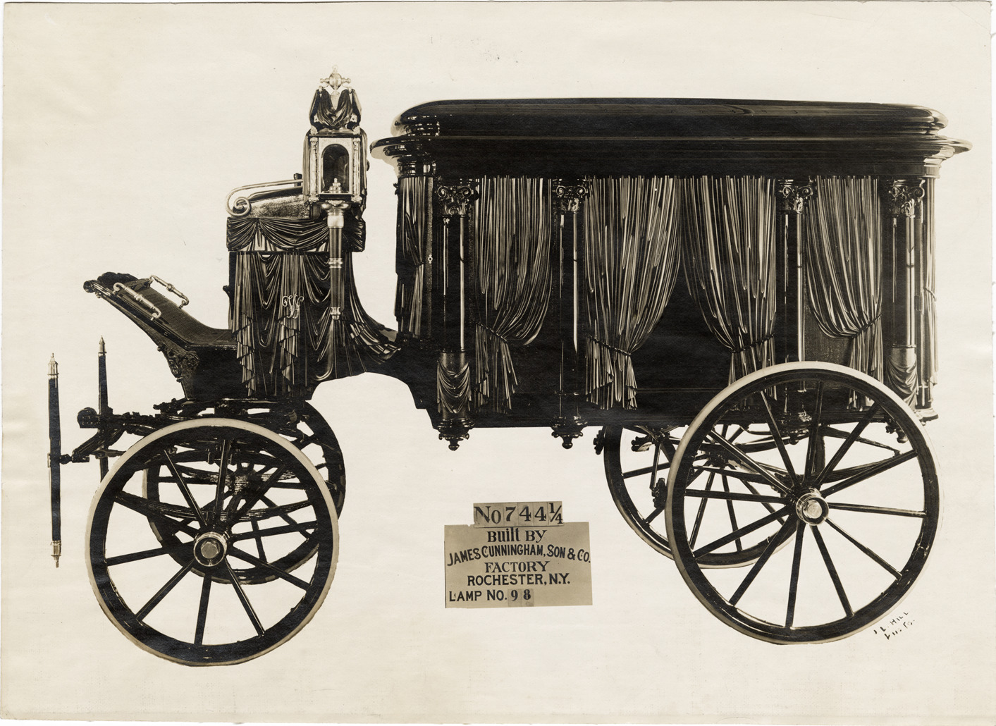 Favorite this☆ Cunningham hearse no. 744-1/4 Description: View of Cunningham horse-drawn hearse no. 744-1/4. Printed on front: "No. 744 1/4. Built by James Cunningham, Son & Co. Factory, Rochester, N.Y. Lamp no. 98. J.L. Hill, photo." Details Resource ID: na043546 Creator: Hill, J.L. Subject: Hearses (Vehicles) Horse-drawn vehicles James Cunningham, Son & Company Photographic prints Date Issued: Unknown year Format: 1 photographic print mounted on fabric ; 7 x 9.5 in. Member of: National Automotive History Collection Filing Location: Cunningham (Horse-drawn) Rights: Physical rights are retained by DPL. Copyright is retained in accordance with U.S. copyright laws.