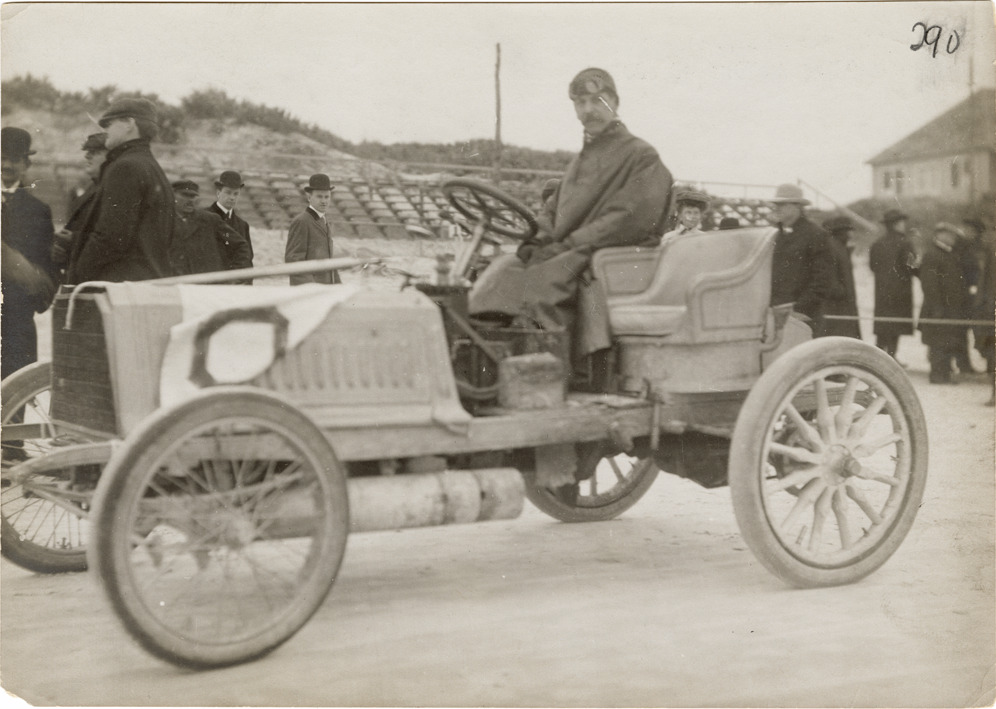 View of F.A. LaRoche posing in Darracq car during the 1904 Ormond-Daytona races in Florida. Handwritten on back: "F.A. LaRoche, Darracq, Ormond-Daytona, Fla. January 1904."
