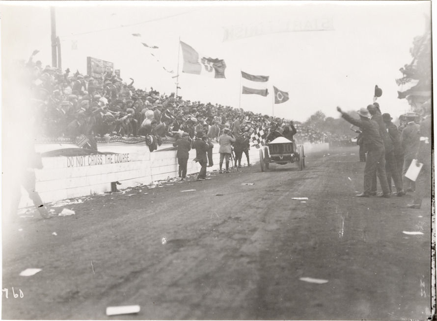 View of Louis Wagner and passenger in Darracq car no. 10 during the 1906 Vanderbilt Cup races on Long Island, New York. Crowd of cheering spectators in grandstand on left. Handwritten on back: "Wagner. Darracq. Vanderbilt, 1906. Darracq, 1906."