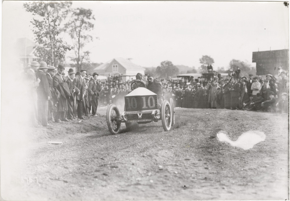 View of Louis Wagner and passenger in Darracq car no. 10 racing past spectators on roadside during the 1906 Vanderbilt Cup races on Long Island, New York. Handwritten on back: "Wagner. Darracq. Vanderbilt, 1906. Darracq, 1906."
