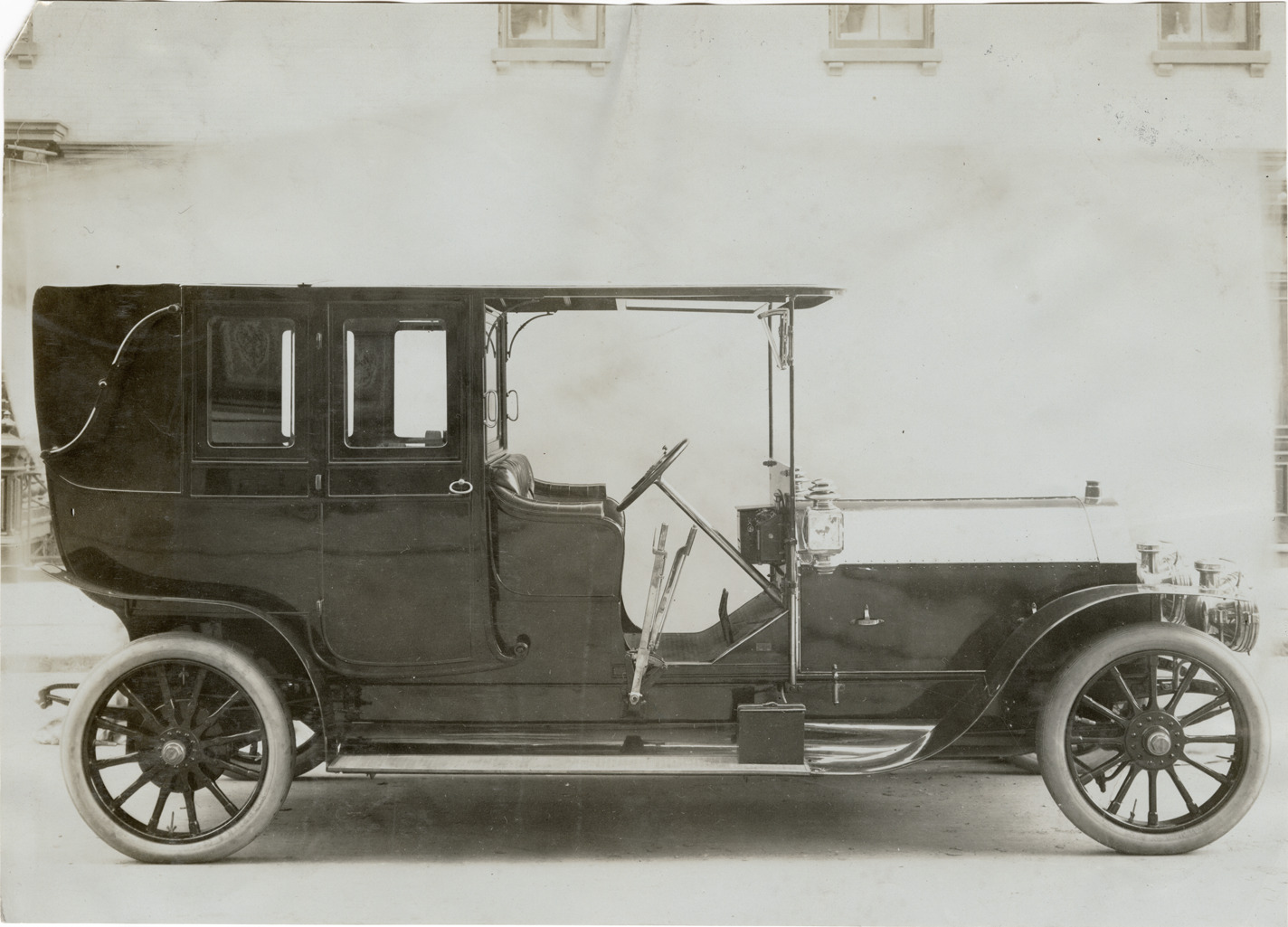 View of a 1907 Darracq car. Handwritten on back: "Darracq, 1907."