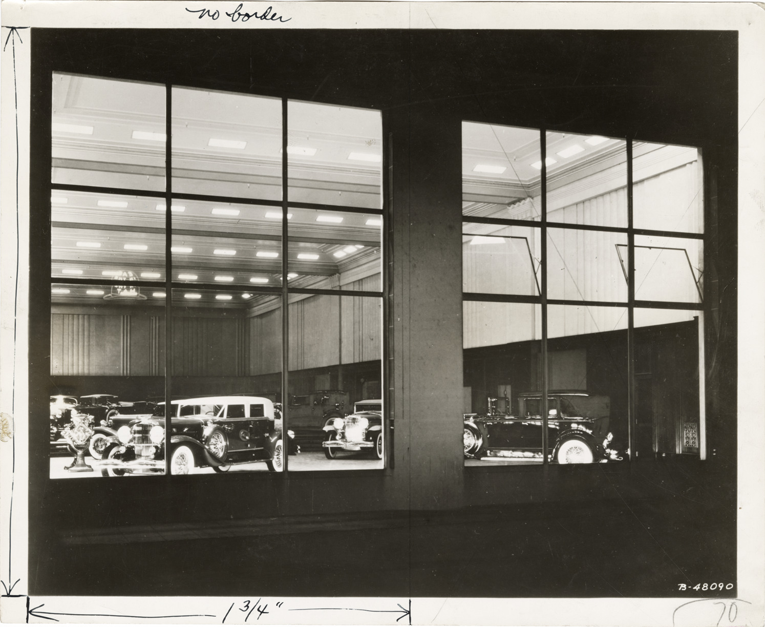 Nighttime view of the showroom at the Auburn Automobile Company dealership in Los Angeles, California. Cars are visible through windows. Label on back: "Night view of the showroom of the new Auburn-Cord home in Los Angeles. Note the indirect lighting system developed exclusively for this building." Handwritten on back: "Dealers, Auburn, 1932."