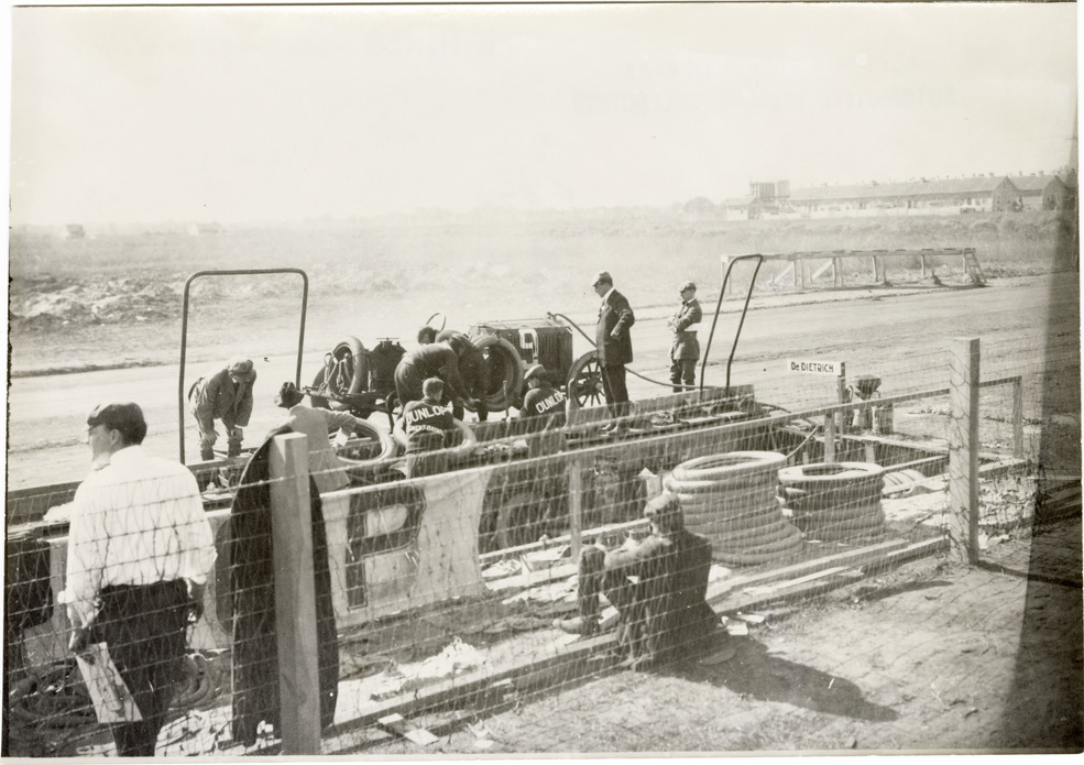 View of pit crew with De Dietrich car no. 9 during the 1908 Grand Prize races in Savannah, Georgia. Tires in foreground. Handwritten on back: "Duray. De Dietrich. Grand Prize, 1908. De Dietrich, '08."
