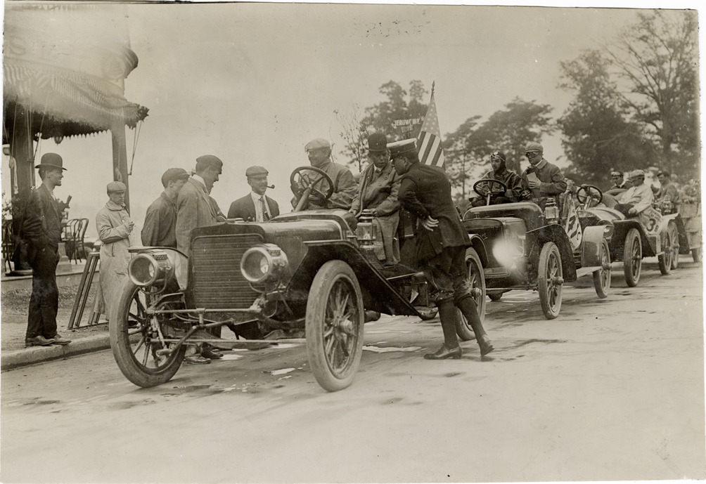 View of motorists in a 1907 Deere car, followed by other cars. Policeman leans over car. Stamped on back: "Spooner and Wells, 1931 Broadway, New York, duplicates any time, enlargements all sizes, tel. 3472-3473 Col., credit appreciated." Handwritten on back: "Deere, 1907."