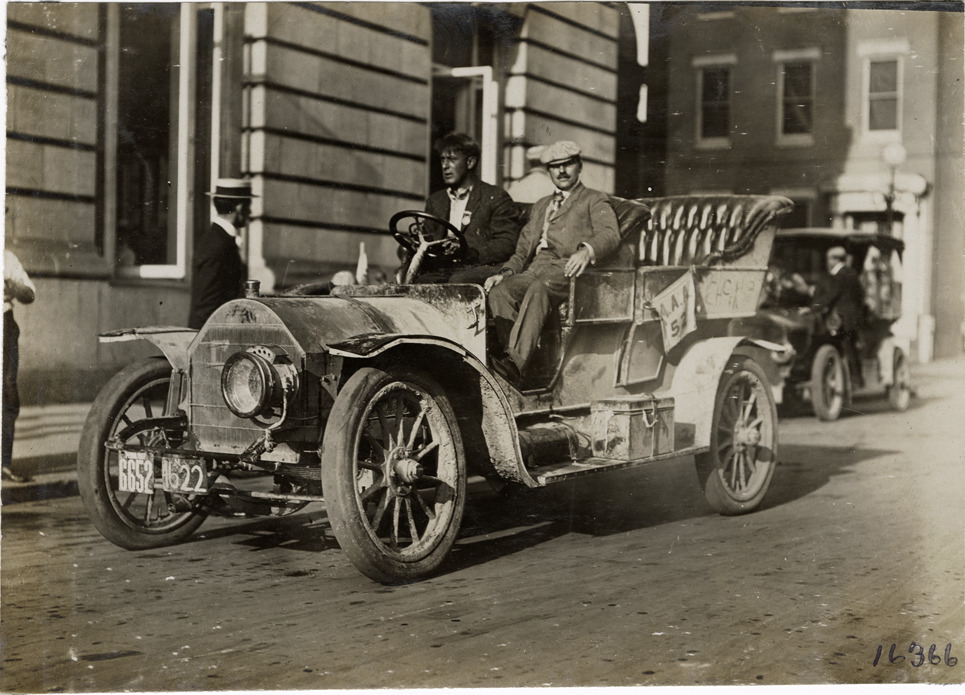 View of motorists posing in 1907 Deere car no. 52 during the 1907 Glidden Tour. Handwritten on back: "Deere, 1907. Glidden."