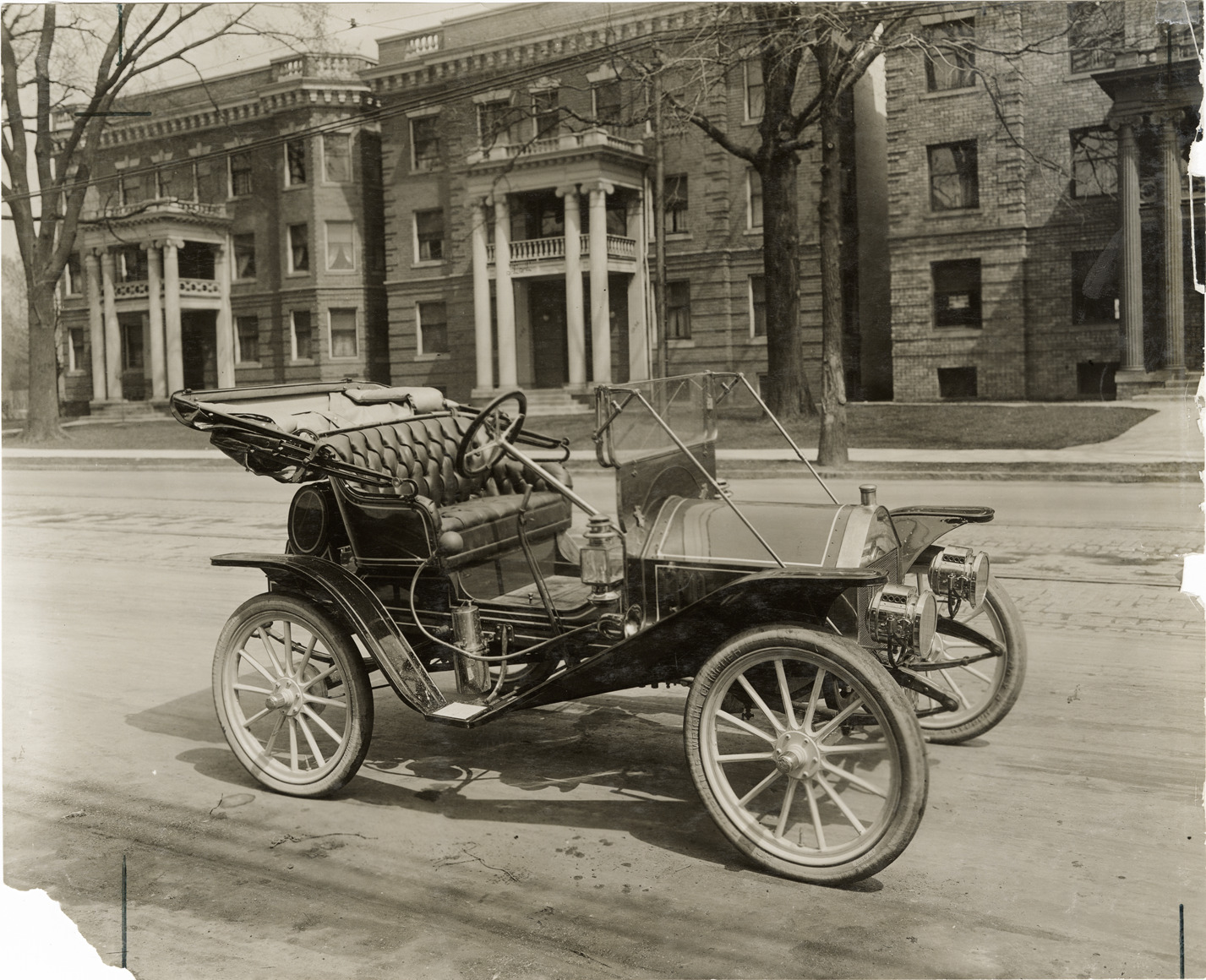 View of a 1910 DeMotcar runabout. Handwritten on back: "DeMotcar, 1910."