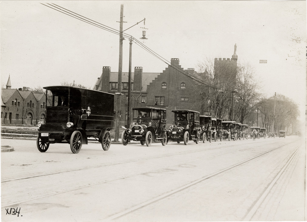 View of Detroit Electric cars, led by a hearse, in the first motorized funeral procession in Detroit. Stamped on back: "Spooner & Wells, Inc., photographers, telephone North 1745. 1231 Woodward Ave., Detroit, Mich. Detroit, 1231 Woodward, New York, 1931 Broadway." Handwritten on back: "Detroit Electric. First motorized funeral in Detroit, ca. 1910."