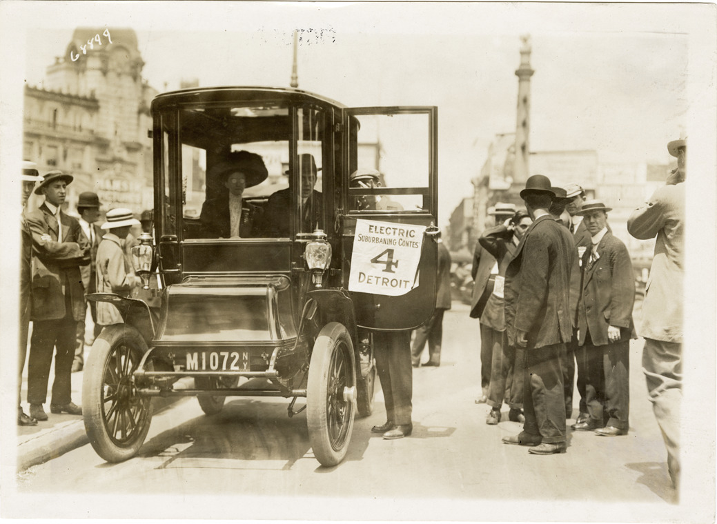 View of motorists with Detroit Electric car no. 4 during the 1911 Electric Suburbaning Contest on Long Island, New York. Sponsored by the Electric Automobile Dealers' Association of New York City, the contest highlighted the advantages of the electric car for suburban use. Stamped on back: "Spooner & Wells, Inc., photographers, telephones 3472-3473 Columbus, 1931 Broadway, New York." Handwritten on back: "Detroit Electric, ca. 1911."