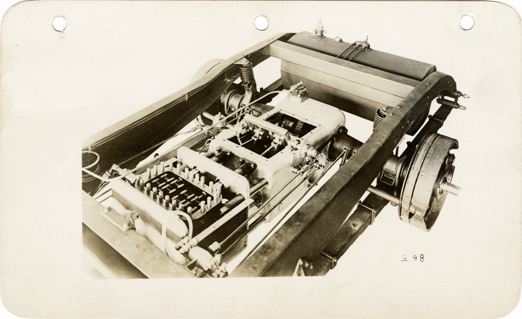 Artist's depiction of a Doble steam car chassis. Handwritten on back: "Doble."