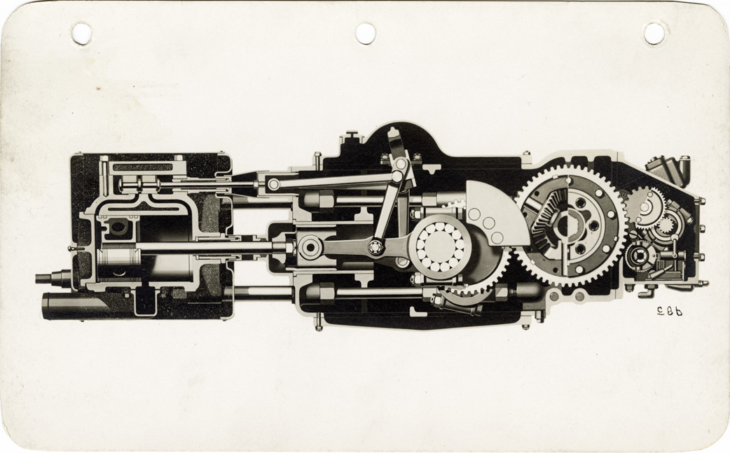 Artist's depiction of parts of a Doble steam car. Handwritten on back: "Doble."