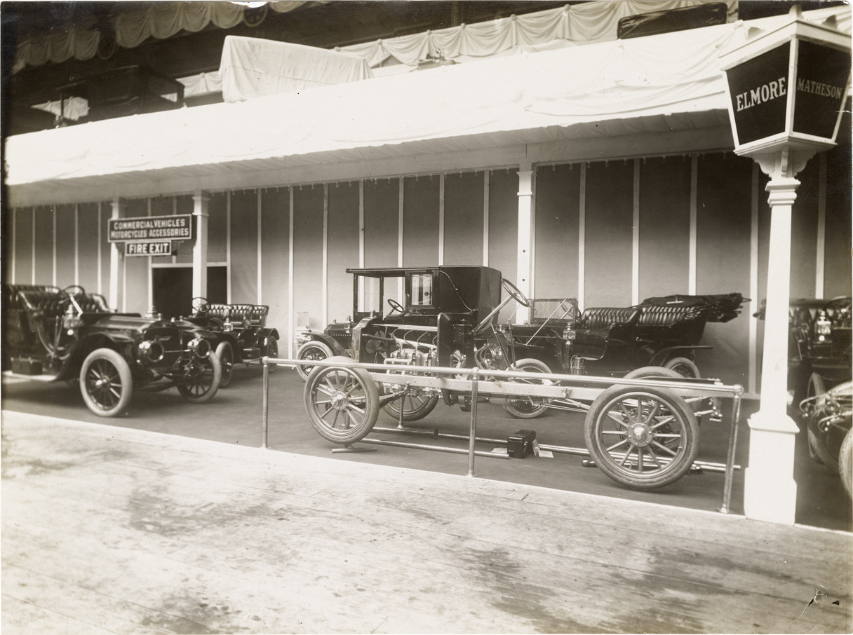 Favorite this☆ 1909 Elmore automobiles and chassis at trade show Description: View of 1909 Elmore cars and chassis on display at trade show. "Elmore" sign in foreground. Stamped on back: "Photo by N. Lazarnick, 29 West 42nd Street, N.Y., tel. 594 Bryant." Handwritten on back: "Elmore, 1909." Details Resource ID: na043751 Creator: Lazarnick, Nathan Subject: Automobiles Automobiles--Chassis Elmore Manufacturing Company Trade shows Photographers--New York (State)--New York Photographic prints Date Issued: 1909 Format: 1 photographic print ; 6 x 8 in. Member of: National Automotive History Collection Lazarnick Collection Filing Location: General photograph files, Elmore Rights: Physical rights are retained by DPL. Copyright is retained in accordance with U.S. copyright laws.