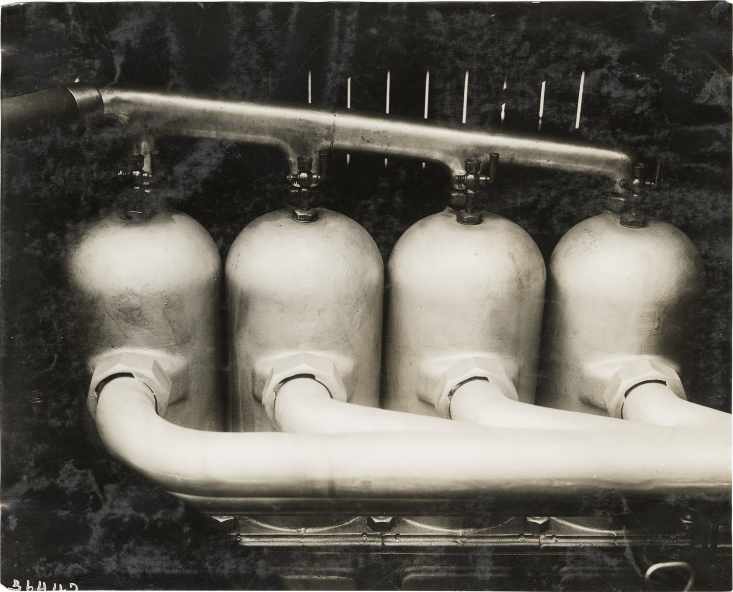 Close-up view of a 1910 Elmore car engine. Stamped on back: "Spooner & Wells, Inc., photographers, telephones 3472-3473 Columbus, 1931 Broadway, New York." Handwritten on back: "Elmore, 1910."