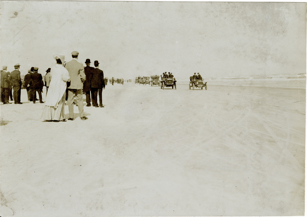 View of cars in the 10 Mile International Race during the 1908 Ormond-Daytona races in Florida. Spectators on beach. Stamped on back: "Photo by N. Lazarnick, 29 West 42nd Street, New York." Handwritten on back: "After the start of the 10 Mile International Race. Races and racing--Ormond-Daytona, 1908."