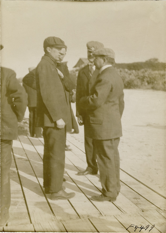 View of driver Emanuel Cedrino, referee Robert Lee Morrell and Mr. Holland during the 1908 Ormond-Daytona races in Florida. Handwritten on back: "Morrell, Holland, Cedrino. Races and racing--Ormond-Daytona, 1908."