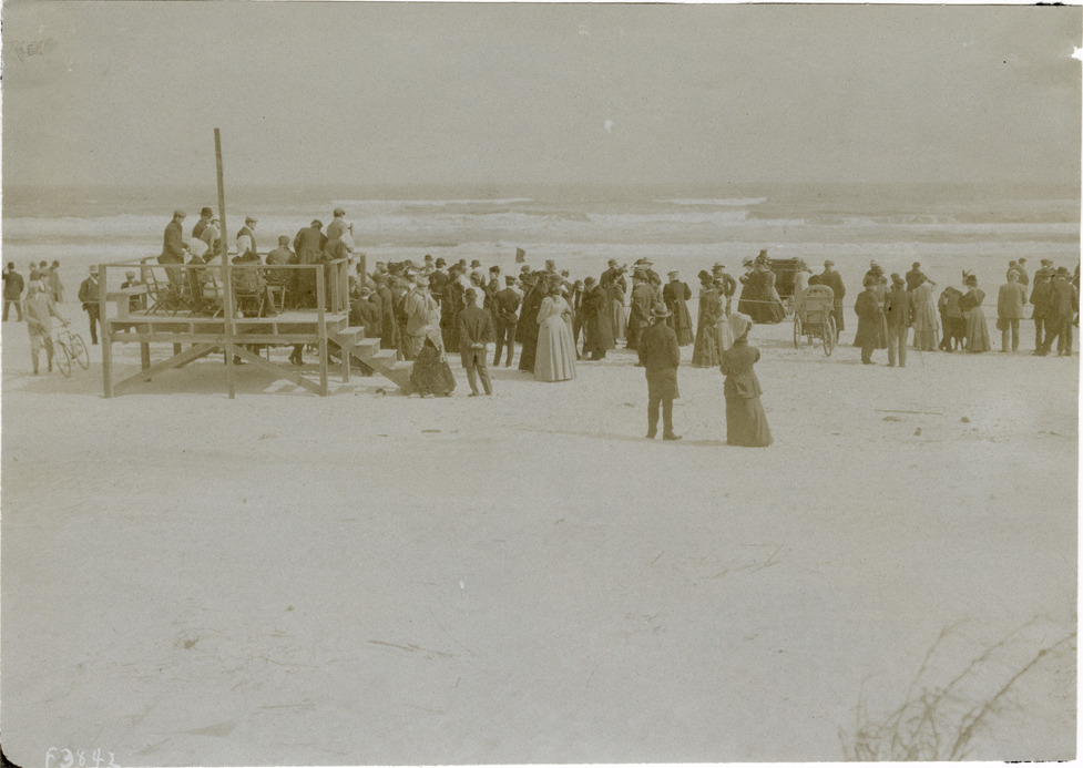 View of judges' stand and spectators on beach during the 1908 Ormond-Daytona races in Florida. Stamped on back: "Photo by N. Lazarnick, 29 West 42nd Street, New York." Handwritten on back: "View of the beach at Ormond. Races and racing--Ormond-Daytona, 1908."