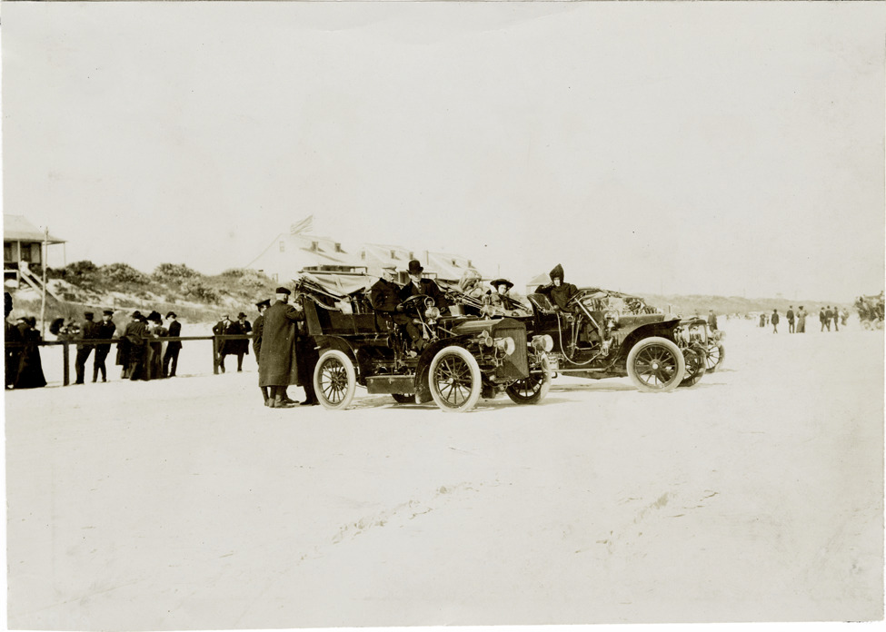 View of Henry M. Flagler in a White steamer on the beach, parked next to another car, during the 1908 Ormond-Daytona races in Florida. Stamped on back: "Photo by N. Lazarnick, 29 West 42nd Street, New York." Handwritten on back: "Flagler in his White car. Races and racing--Ormond-Daytona, 1908."