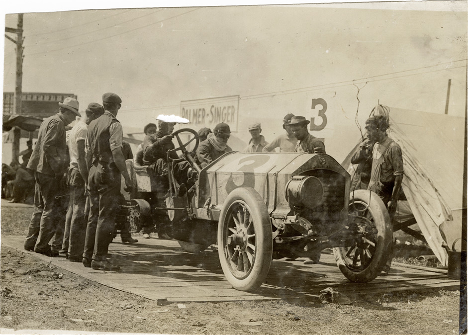 View of driver Cy Patschke and pit crew with Acme car no. 3. Stamped on back: "Photo by Spooner & Wells, Inc. 1931 Broadway, N.Y." Handwritten on back: "Acme #3, replacing a tire, Patschke driving."