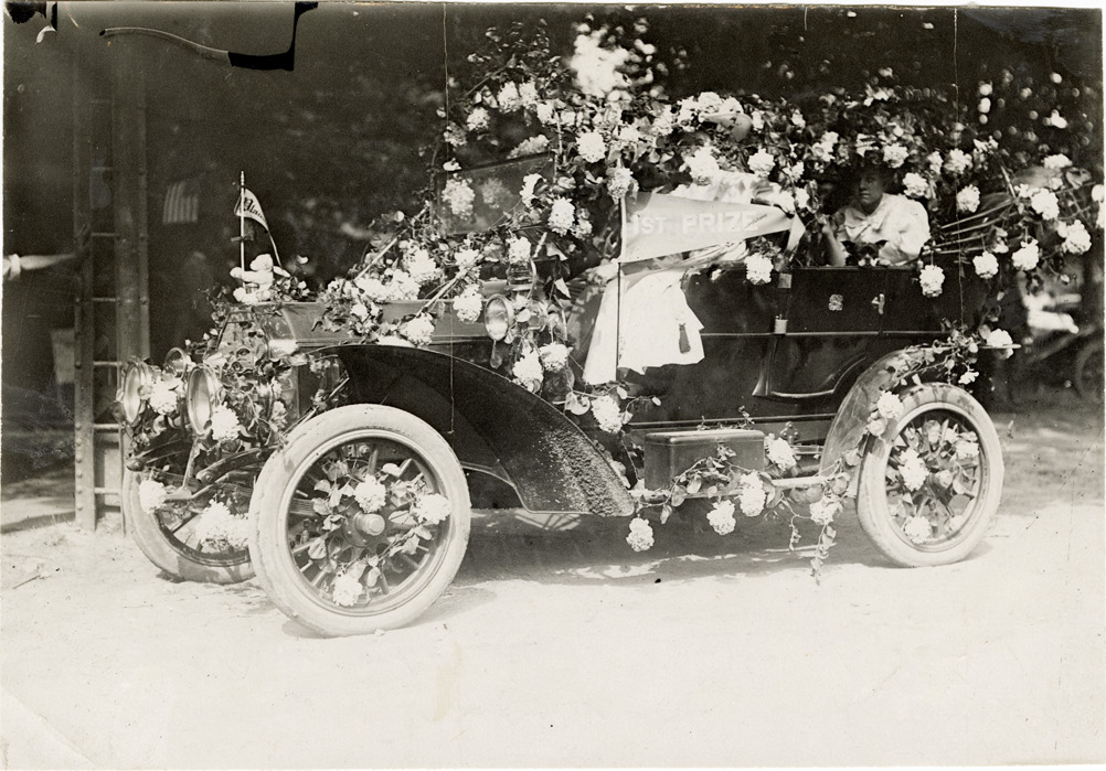 View of women motorists posing in Peerless car which is covered with floral decorations. "1st prize" pennant is displayed on car. Stamped on back: "Spooner & Wells, Inc., photographers, telephones 3472-3473 Columbus, 1931 Broadway, New York." Handwritten on back: "Peerless, winner of the first prize at the celebration at Plainfield, 7/6/09."