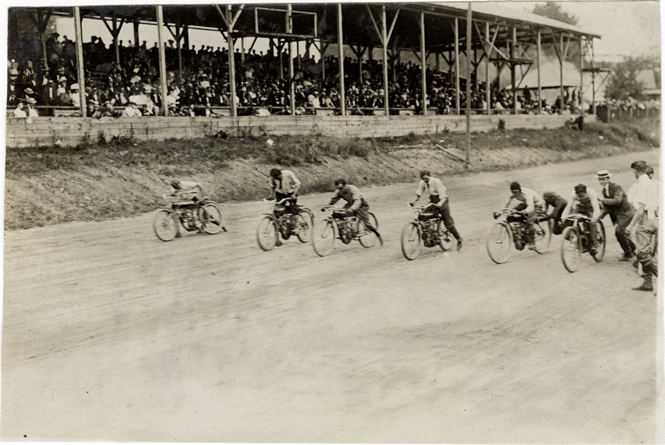 View of men with motorcycles on track at the start of 5 mile miss and out race. Spectators in grandstand. Stamped on back: "Photo by Spooner & Wells, Inc. 1931 Broadway, N.Y." Handwritten on back: "Start of 5 mile miss & out, won by Goerke. Motorcycles."